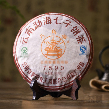 2007年八角亭7590采用经典配方,以云南大叶种晒青毛茶为原料,采用其多年积累的发酵工艺蒸压而成,饼形圆润,松紧适度。条索肥壮,金毫显露,色泽红褐,干茶香纯正浓郁。其云南勐海七子饼茶系列(7540、7590、0432 、早春银毫、越陈越香)已在普洱茶业内为人熟知,并成为众多普洱茶茶友竞相收藏的普洱茶珍品。