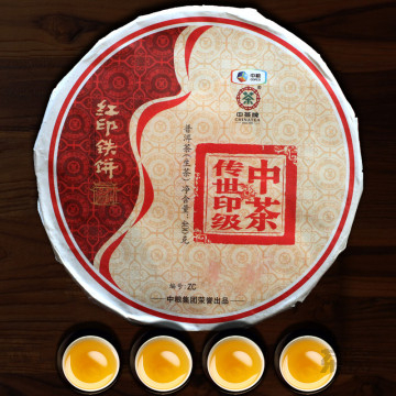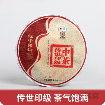 2016年中茶牌中茶传世印级—红印铁饼,力与美的结合,改变的不仅仅是压力。通过岁月的力量,让我们陪着它,慢下来,尊享茶美生活。色泽墨绿,条索完整,白毫较多,饼形厚实。