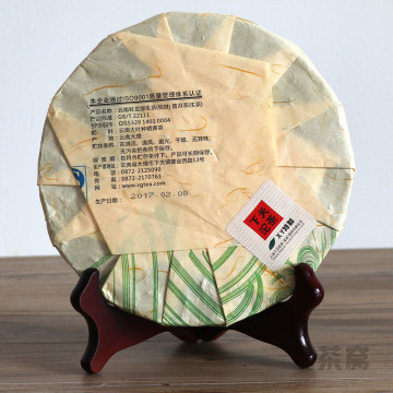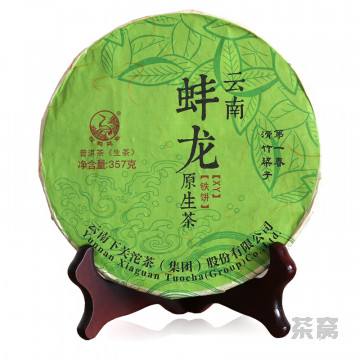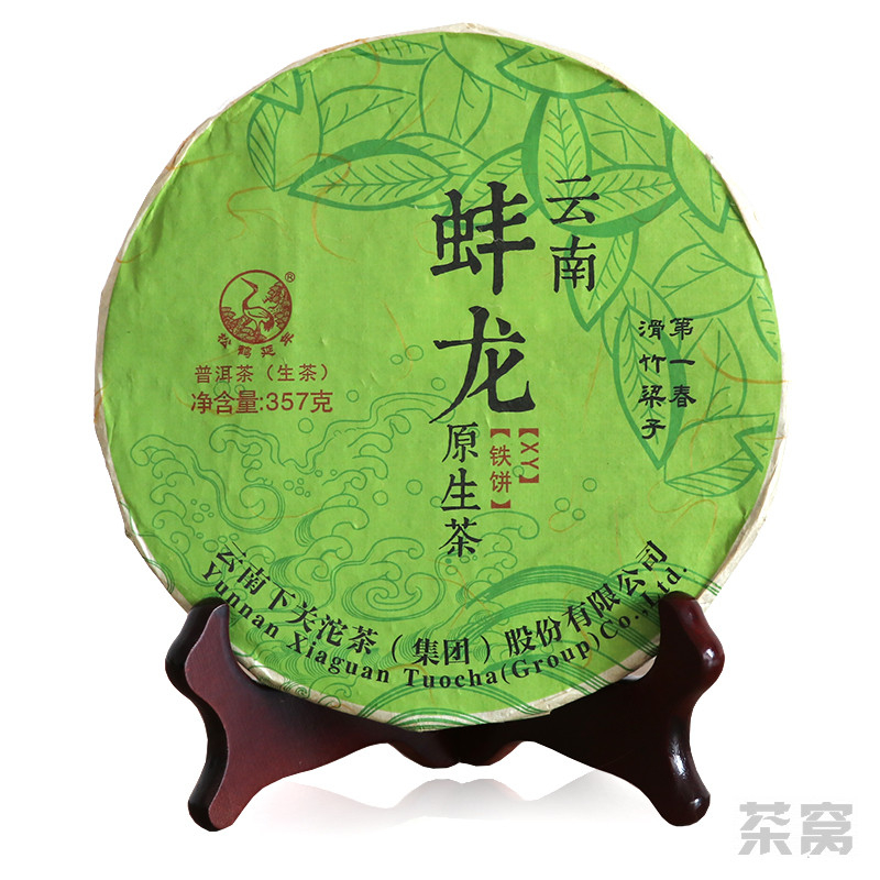 2017年下关 云南蚌龙原生茶 (XY特制)铁饼——甄选滑竹梁子一芽两叶晒青毛茶为原料,经下关沱茶制茶技艺“铁饼”压制而成,其饼形紧结圆润,压制均匀,饼面呈墨绿色,色泽油润。