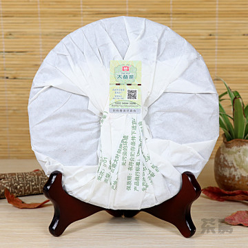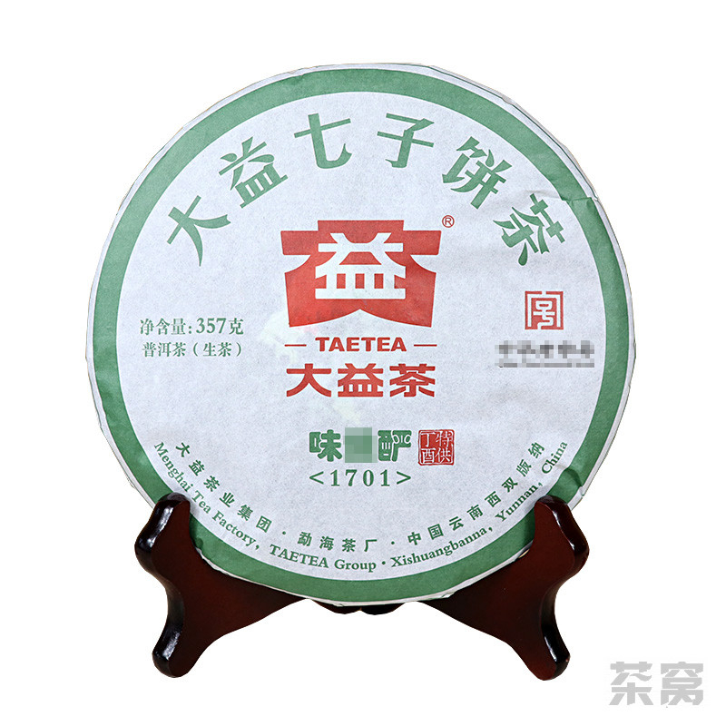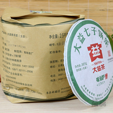 产品包装——依旧采用棉纸包装。每件4袋,净重10kg。包装封面整体采用青绿色,鲜活靓丽。沿袭大益经典系列风格。