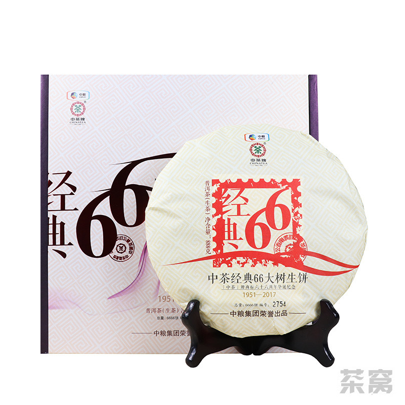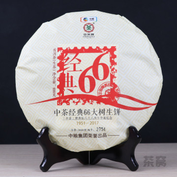 2017年正值中茶商标诞生66周年,中茶公司为了庆贺这一事件特别推出了中茶经典66大树生饼普洱茶(生茶),这款茶甄选云南大叶种大树春茶作为原料制成。