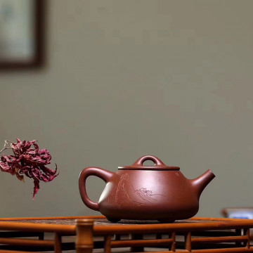 此款石瓢气韵罡正,比例协调。嘴直流,出水流畅,平嵌盖,把圆中带方,线条收放自如。壶身刻绘“台阁山林本无异,鱼鸟江湖只自知” 苍劲有力,字字见功!反面刻老者小憩图,整体做工精致,实用器首选!