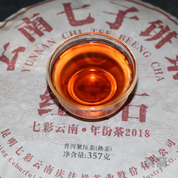 茶青采摘后,经过萎凋、杀青、揉捻、晒干, 再经过自然发酵(选地、 堆茶、洒水、翻堆、开沟、养茶、分选、灭菌)这一重要工艺后,把 熟茶毛茶蒸压成型;普洱熟茶外观呈棕褐色,(新制的一般都会带有 轻微堆味,放置一段时间便会退去),熟茶汤色红亮稠丽,似葡萄酒 ,口感厚滑甘润,香甜细腻。