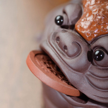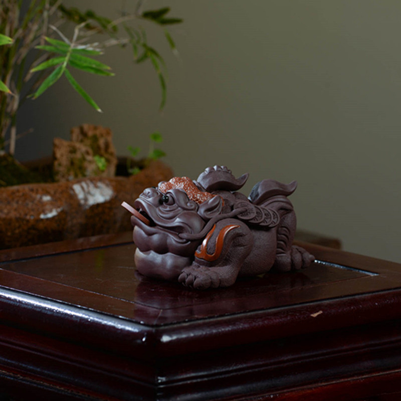 丹顶额头,祥瑞之意,寓意鸿运当头,眼睛炯炯有神,充满灵气,腰部钱币连串,腰缠万贯,寓意美好,茶桌美物,好风好水。