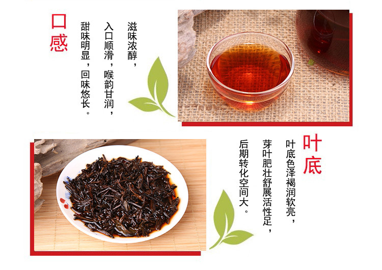 茶青采摘后,经过萎凋、杀青、揉捻、晒干, 再经过自然发酵(选地、 堆茶、洒水、翻堆、开沟、养茶、分选、灭菌)这一重要工艺后,把 熟茶毛茶蒸压成型;普洱熟茶外观呈棕褐色,(新制的一般都会带有 轻微堆味,放置一段时间便会退去),熟茶汤色红亮稠丽,似葡萄酒 ,口感厚滑甘润,香甜细腻。