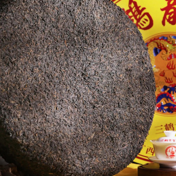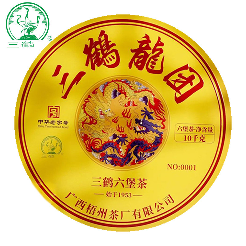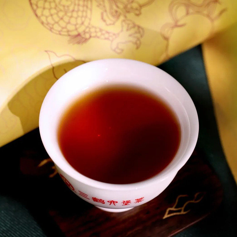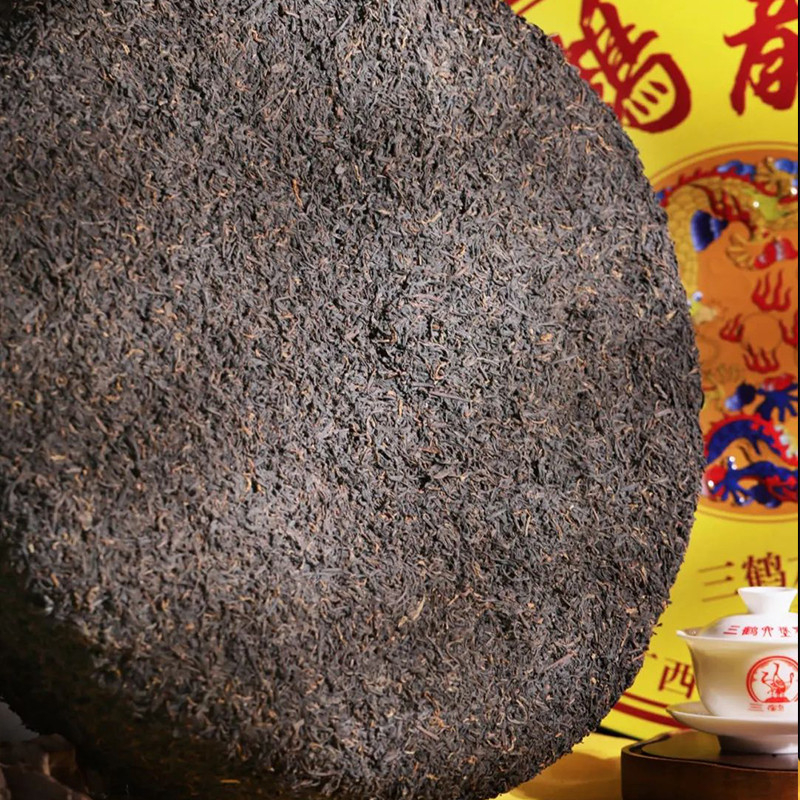 2023年三鹤龙团(六堡茶紧压茶),2018年10月起始陈化; 三鹤龙团取用大箩茶核心位置,特级槟榔香老料经传统工艺制作; 干茶色泽黑褐光润,条索紧细、金毫显露; 槟榔香高扬,兼着幽雅花香,层次丰富,生津回甘明显。
