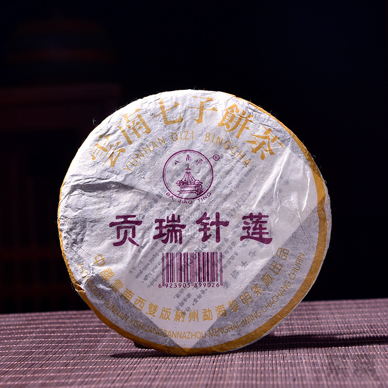 2005年八角亭贡瑞针莲熟茶,选用云南勐海茶区大叶种晒青毛茶传统工艺发酵,用料精细,昆明干仓自然陈放20年,棉纸包装完整干净,高香无油,干茶香浓郁;条索紧结,细嫩完整,色泽红褐,油润显金毫,里外一口料压制;