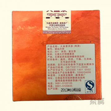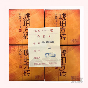 2013年大益琥珀方砖熟茶选取当时两三年间每个熟茶发酵堆中筛选出来的嫩芽适当拼配当年新料,精致而成;目前已在昆明干仓存放十余年,砖形方正,厚薄均匀,松紧适度,条索紧结,显金毫;汤色褐红,陈香甜香浓郁,茶汤粘稠顺滑,滋味醇厚饱满;叶底色泽褐红匀整。