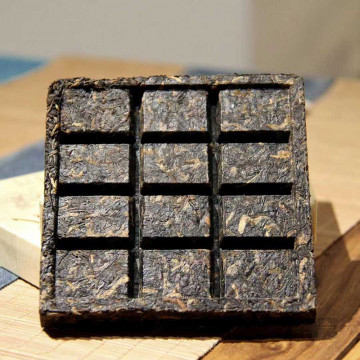 每块茶砖重125g,分成十二宫格,制作之时精选五年陈料,至今已陈化有十余年,外形小巧精致,砖形端正,条索墨绿油润,紧实,显金毫,纹路清晰,匀整平滑。