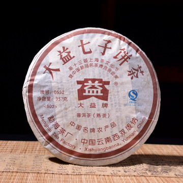 大益0532为2005年始创配方的高端产品。是勐海茶厂改制一周年之际特别推出的高端贺岁产品,选用勐海茶区肥壮茶菁为原料,以三级料拼配,用料等级非常高;其茶饼周正,茶条索细嫩芽头多,色泽红褐显金毫。经过十余年的陈期,茶汤红浓透亮,陈香纯正高扬,茶汤润滑柔和,滋味醇浓饱满,层次感强。