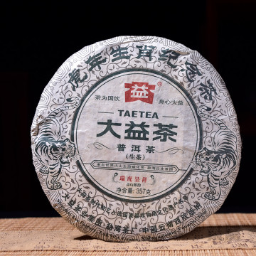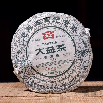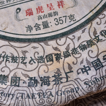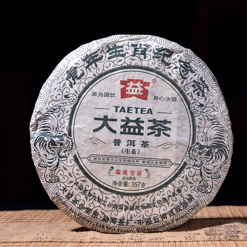 大益集团勐海茶厂于2010年推出大益第1款生肖贺岁纪念茶--虎年生肖纪念茶,"瑞虎呈祥"。精选勐海高山茶区优质春茶为原料,以中壮茶箐为心,拼配细嫩芽叶为盖,经多次调试研制、精心拼配而成。茶品饼形饱满、条索清晰完整,饼面色泽墨绿油润,细嫩显毫;汤色金黄剔透,滋味醇厚饱满,鲜爽回甘,口感丰富协调,韵味十足;香气高扬、纯正,持久性强。